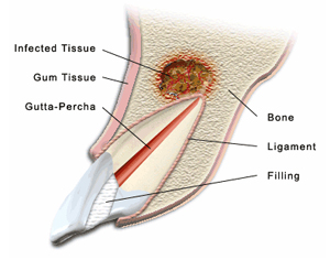 The damaged tissue is removed along with the end of the root tip. A root-end filling is placed to prevent reinfection of the root and the gum is sutured. The bone naturally heals around the root over a period of months restoring full function.